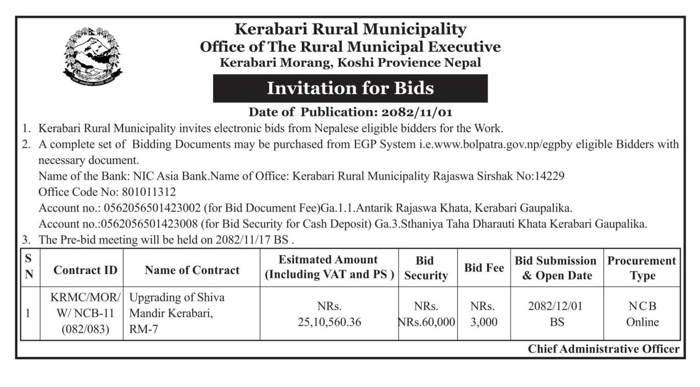 » केराबारी गाउँपालिका वडा नं ७ मा मन्दिर निर्माण सम्बन्धि बोलपत्र आव्हानको सूचना ।