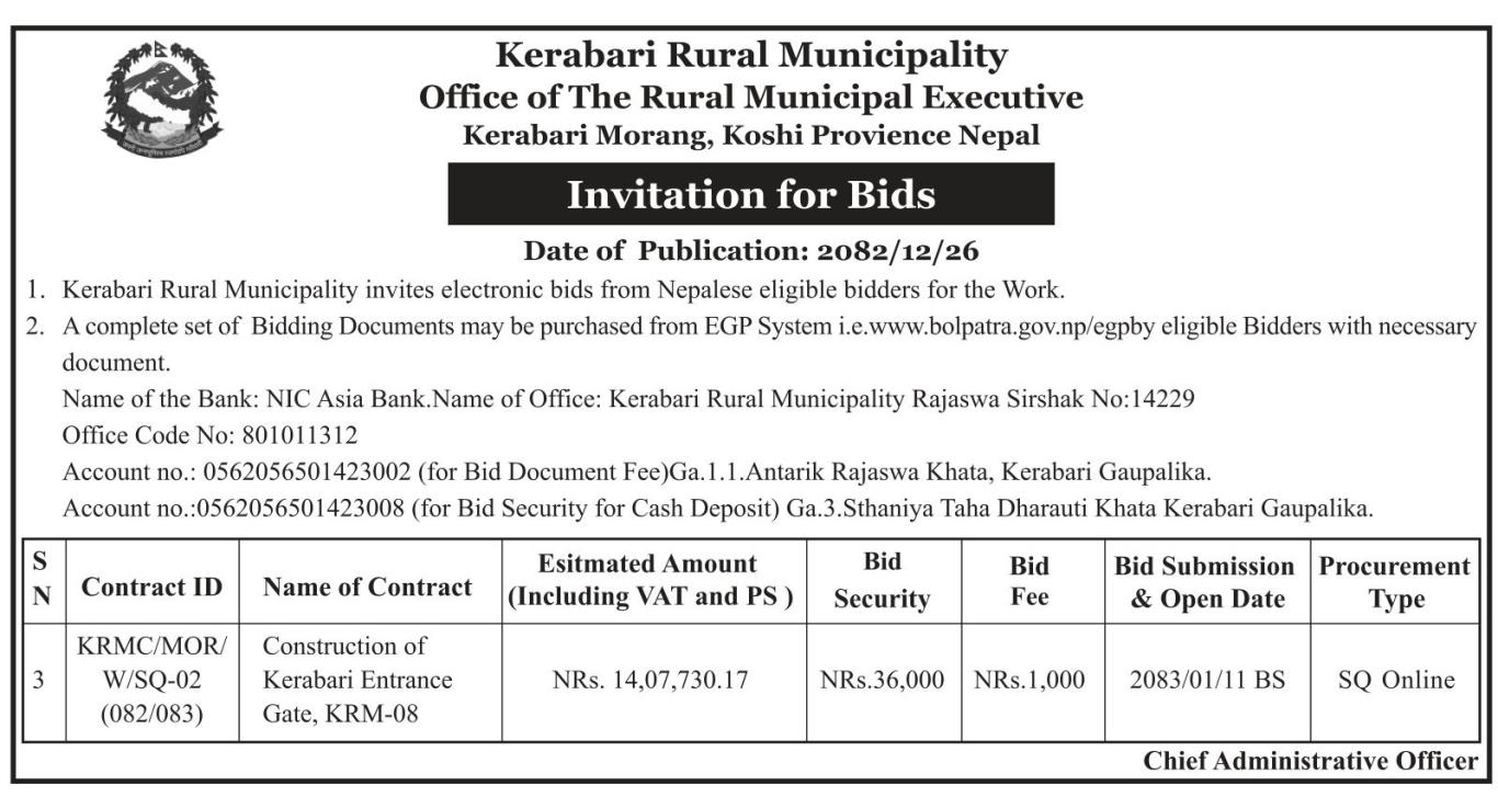 » केराबारी प्रवेश द्वार निर्माण सम्बन्धि शिलबन्दी दरभाउपत्र आव्हानको सूचना ।मिति २०८२।१२।२६