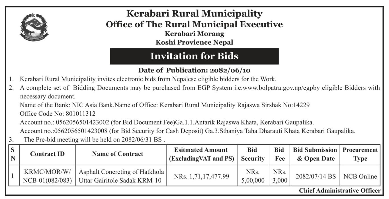 केराबारी १० हाटखोला उत्तर गैरी टोल सडक कालोपत्रे सम्बन्धी बोलपत्र आव्हानको सूचना ।