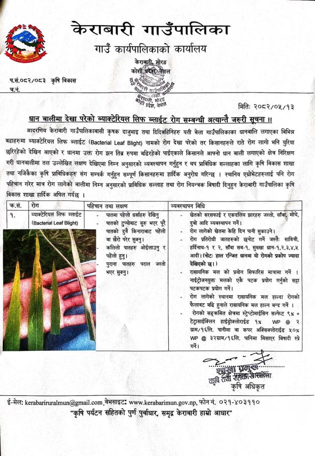 » धान बालीमा देखा परेको ब्याक्टेरियल लिफ ब्लाईट रोग सम्बन्धी अत्यब्तै जरुरी सूचना ।