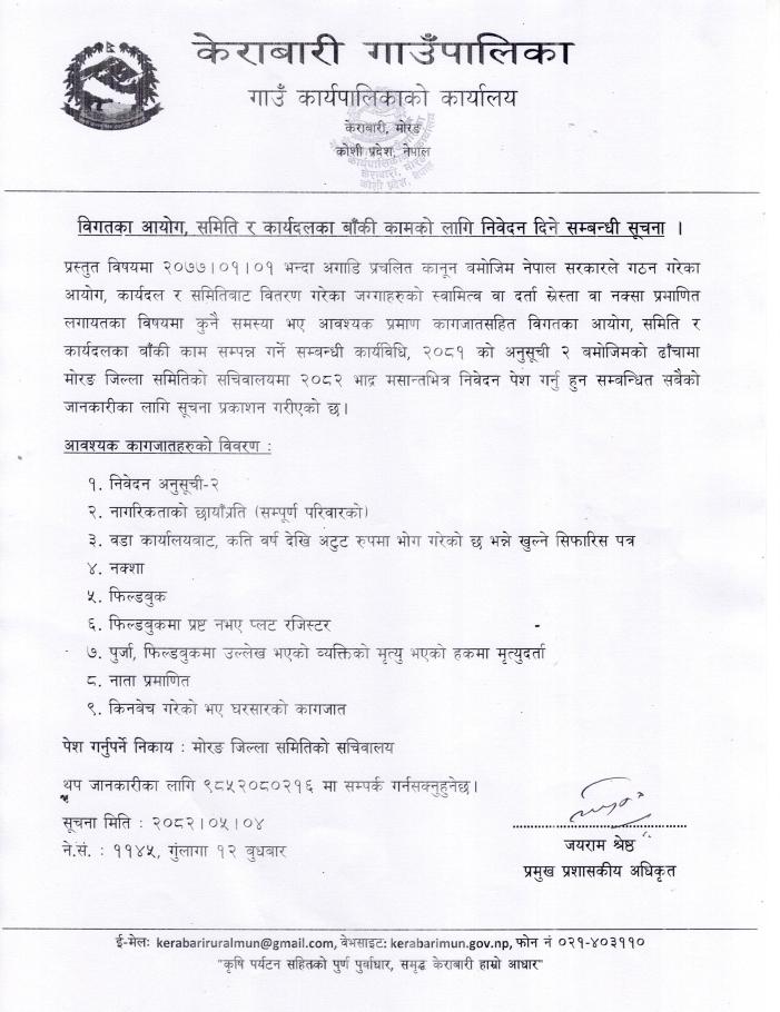 बिगतका आयोग, समिति र कार्यदलका बाँकी कामको लागि निवेदन दिने सम्बन्धी सूचना ।