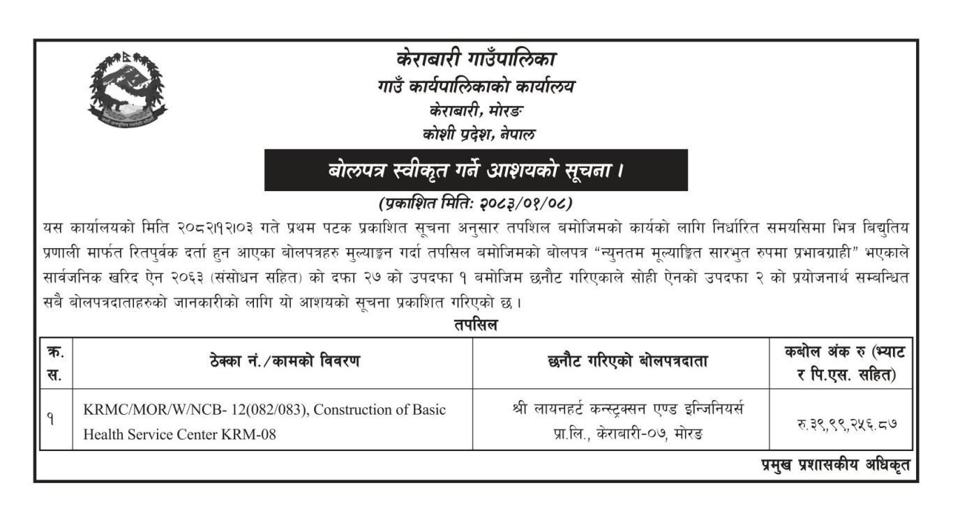 » बोलपत्र स्वीकृत गर्ने आशयको सूचना ।(मिति २०८३।०३।०७)