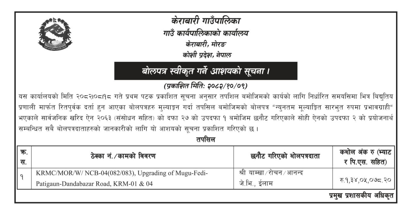 बोलपत्र स्वीकृत गर्ने आसयको सूचना ।(मितिः२०८२।१०।०९)