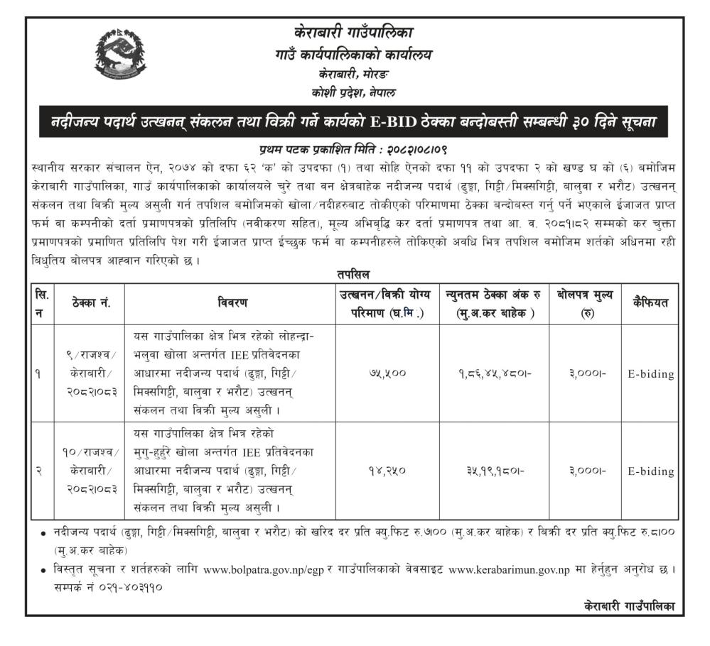 Home » भलुवा-लोहन्द्रा र मुगु-हुर्हुरे खोलाको नदीजन्य पदार्थ उत्खनन् संकलन तथा विक्री गर्ने कार्यको E-Bid ठेक्का बन्दोबस्ती सम्बन्धी बोलपत्र आव्हानको सूचना ।