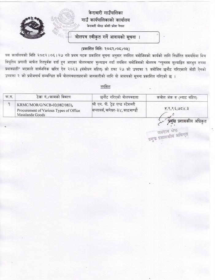 मसलन्द सामग्री खरिद सम्बन्धी बोलपत्र स्वीकृत गर्ने आसयको सूचना ।