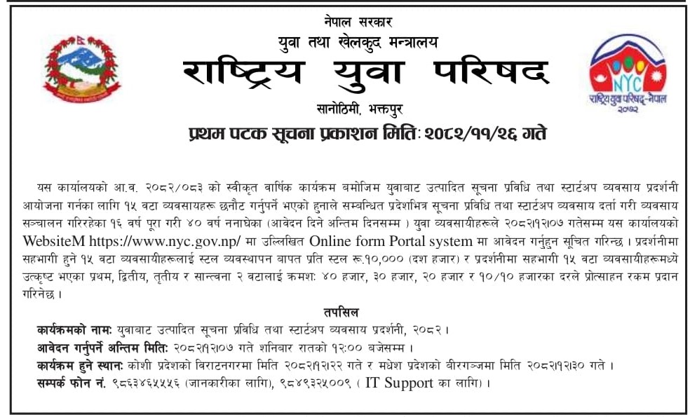 » युवावाट उत्पादित सूचना प्रविधी तथा स्टार्टअप व्यवसाय प्रदर्शनीमा सहभागी हुने सम्बन्धिको राष्ट्रिय युवा परिषदको सूचना ।