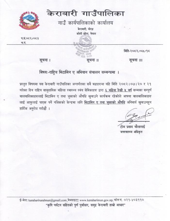 » राष्ट्रिय भिटामिन ए अभियान संचालन सम्बन्धी सूचना ।