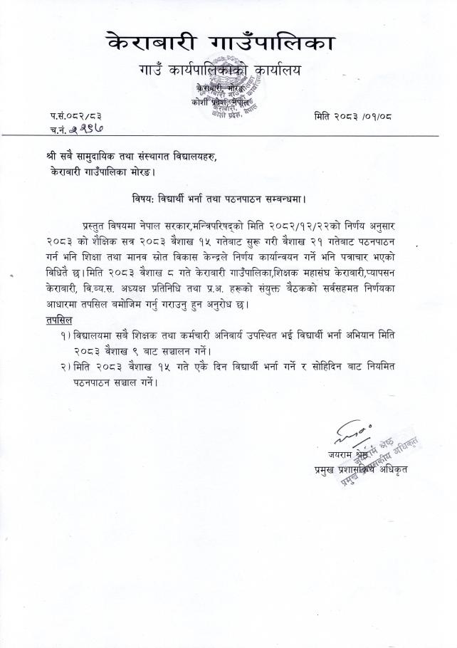» विद्यार्थी भर्ना तथा पठनपाठन सम्बन्धि परिपत्र/जानकारी ।