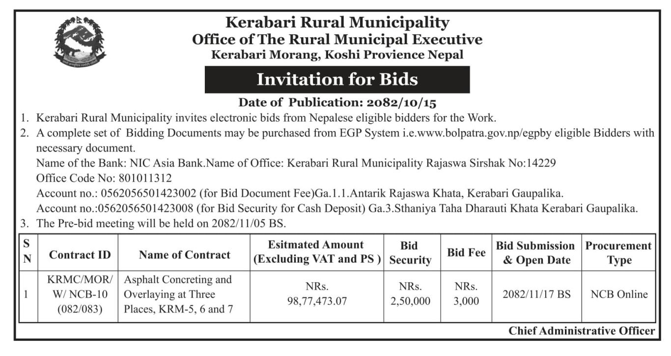 केराबारी गाउँपालिका वडा नं ६ मुगु खोला पुल देखि वडा नं ७ लाङ्घाली चौकसम्म कालोपत्रे सडक मर्मत, केराबारी गाउँपालिका वडा नं ५ हुलाक चौक उत्तर सडक कालोपत्रे र केराबारी गाउँपालिका वडा नं ७ सिमल चौक दक्षिण सडक कालोपत्रे सम्बन्धि बोलपत्र आव्हानको सूचना ।