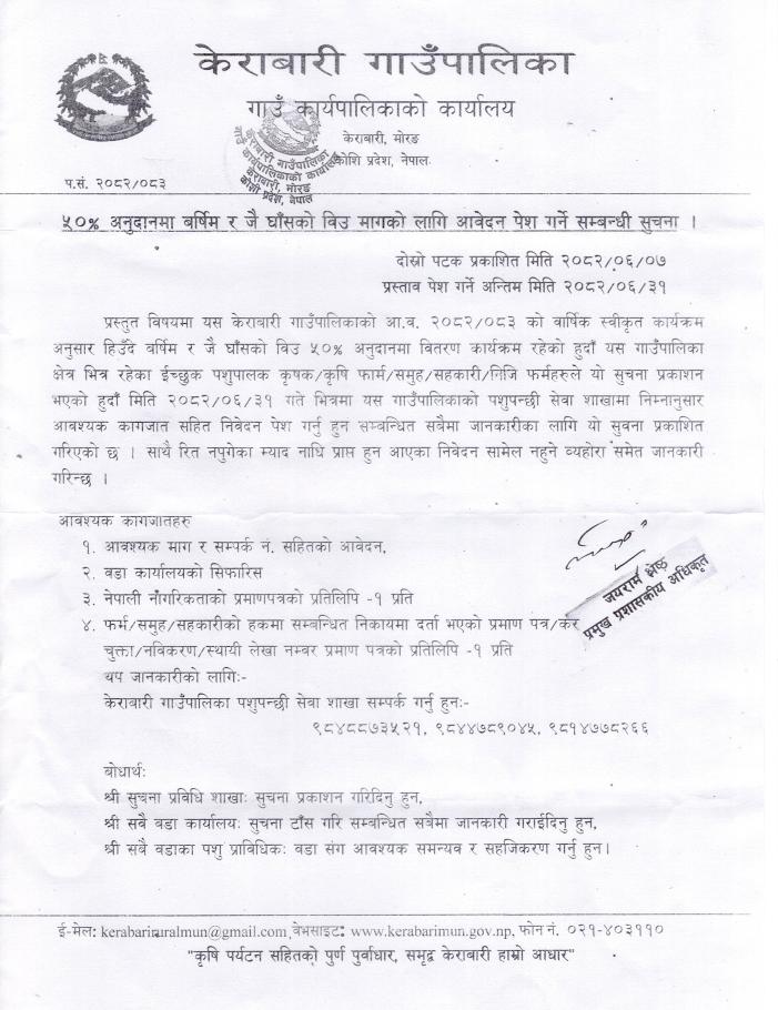 ५० % अनुदानमा बर्षिम र जै घाँसको बिउ मागको लागि आवेदन पेश गर्ने सम्बन्धी दोश्रो पटक प्रकाशित सूचना ।