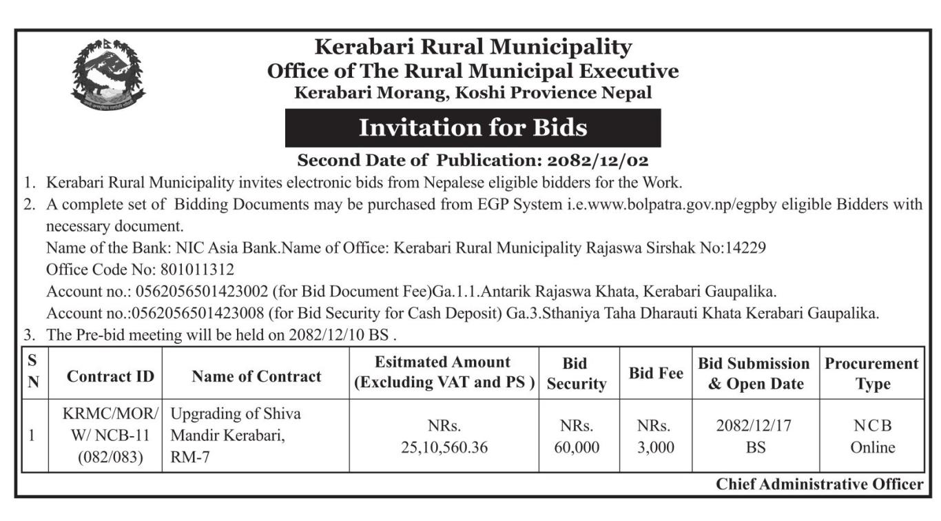 केराबारी गाउँपालिका वडा नं ७ मा मन्दिर निर्माण सम्बन्धि दोश्रो पटक बोलपत्र आव्हानको सूचना ।