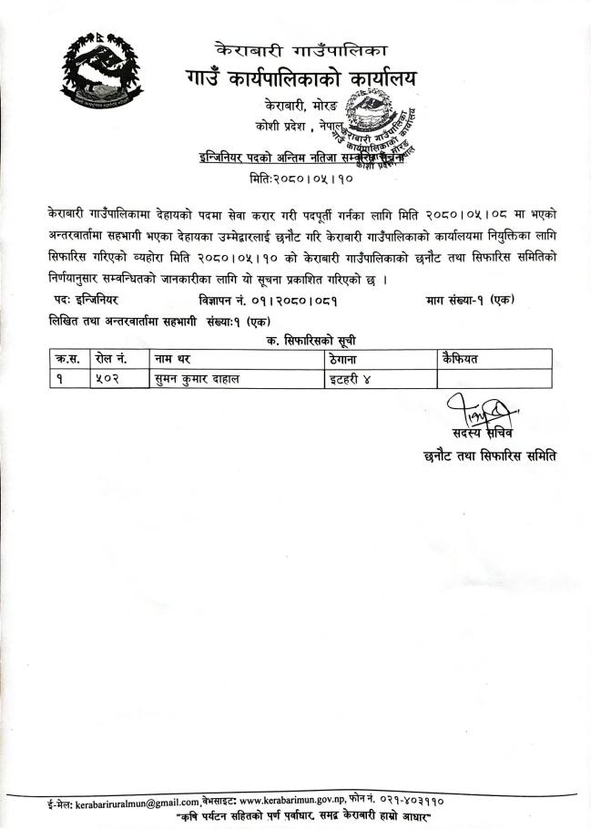 इन्जिनियर पदको अन्तिम नतिजा सम्बन्धि सूचना ।