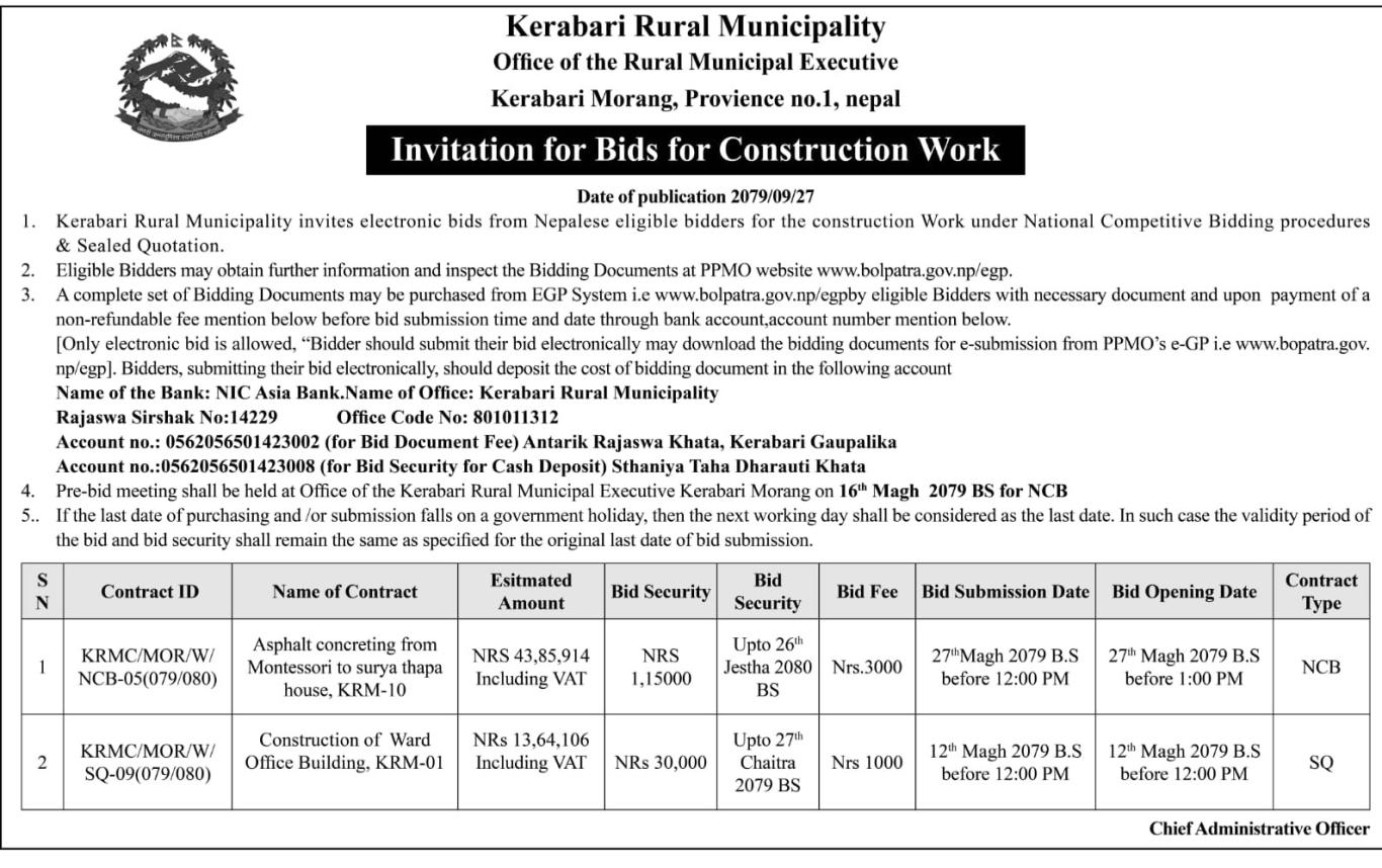 Home » कालोपत्रे सडक निर्माण सम्बन्धि बोलपत्र दोश्रो पटक र १ नं वडा कार्यालय भवन निर्माण सम्बन्धि शिलवन्दी दरभाउपत्रको तेश्रो पटक सूचना प्रकाशित गरिएको सूचना ।