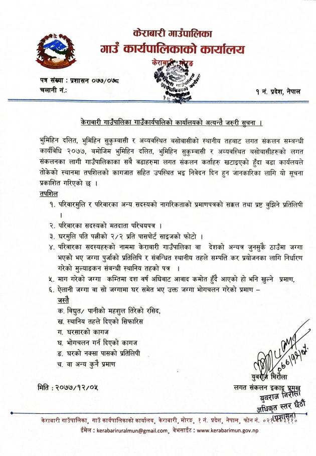 केराबारी गाउँपालिका गाउँकार्यपालिको कार्यालयको अत्यन्तै जरुरी सुचना ।