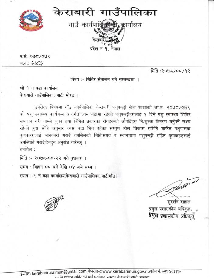 केराबारी गाउँपालिका वडा नं १ पाटीमा पशु स्वास्थ्य शिविर संचालन गर्ने सम्बन्धि सूचना ।