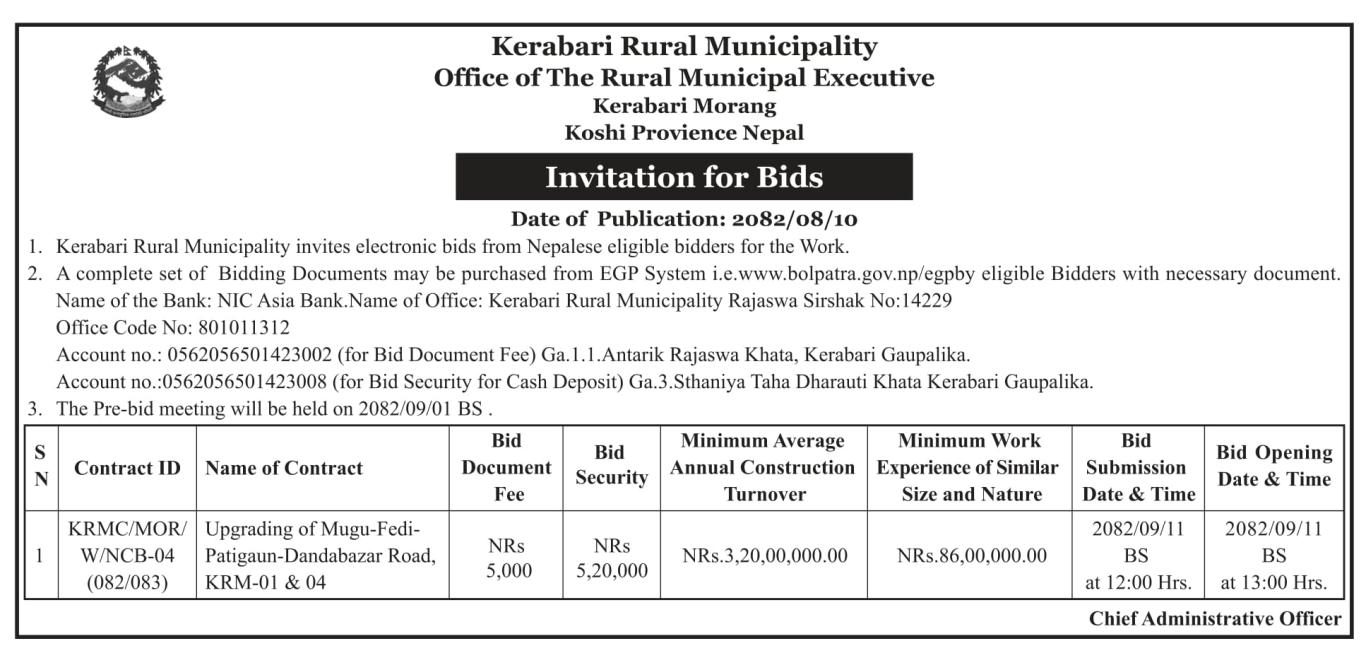 » केराबारी गाउँपालिका वडा नं ४ र १ मा रहेको मुगु-फेदी-पाटीगाउँ-डाडाँ वजार सडक स्तरोन्नति सम्बन्धी बोलपत्र आव्हानको सूचना ।