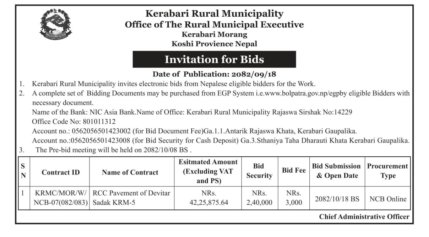 केराबारी गाउँपालिका वडा नं ५ देविटार सडक निर्माणको लागि बोलपत्र आव्हानको सूचना ।