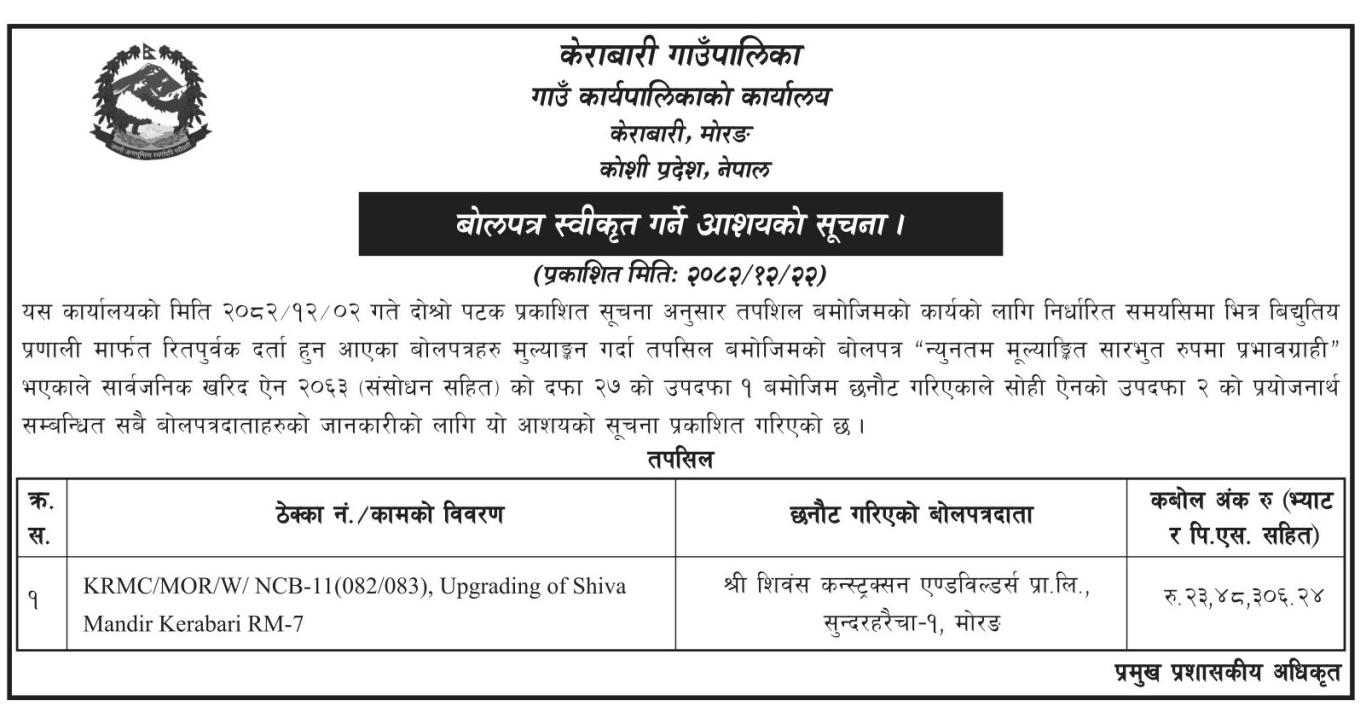 » केराबारी गाउँपालिका वडा नं ७ मा शिव मन्दिर निर्माण सम्बन्धि बोलपत्र स्वीकृत गर्ने आसयको सूचना ।