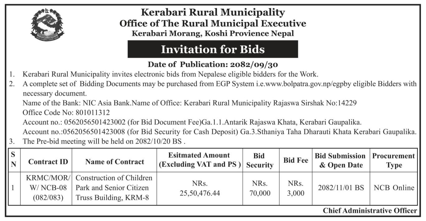 » केराबारी गाउँपालिका ८ मा बाल उद्यान र जेष्ठ नागरिक भवनमा ट्रस निर्माण सम्बन्धि बोलपत्र आव्हानको सूचना ।