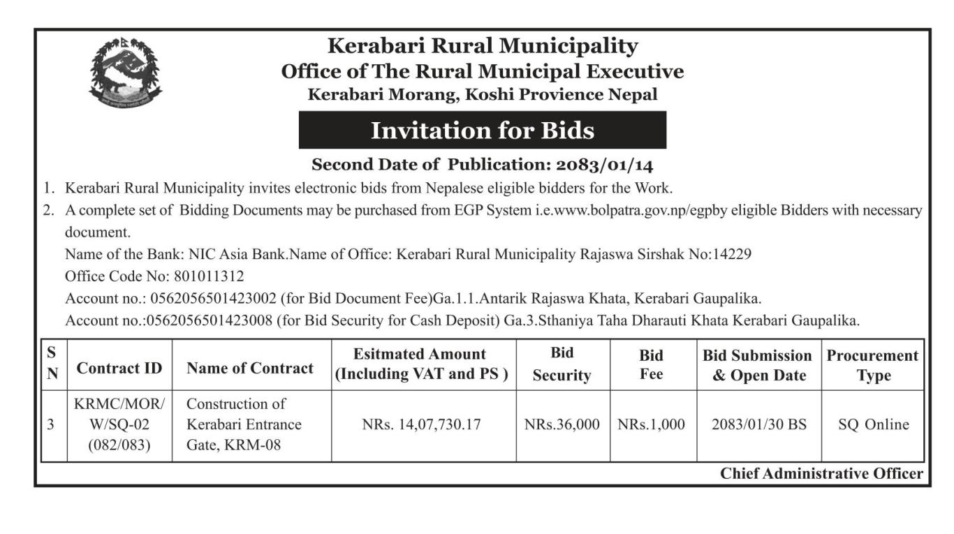 केराबारी प्रवेश द्वार निर्माण सम्बन्धि दोश्रो पटक शिलवन्दी दरभाउपत्र आव्हानको सूचना ।