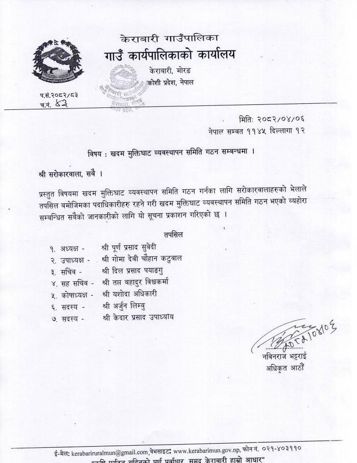 खदम मुक्तिघाट व्यवस्थापन समिति गठन सम्बन्धमा ।