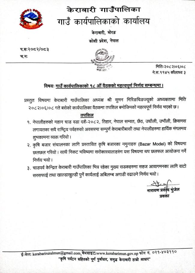 » गाउँ कार्यपालिकाको १८ औं वैठकको महत्वपूर्ण निर्णय सम्बन्धमा । (मिति २०८२।०६।०८)
