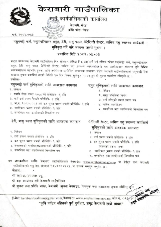 » पशुपन्छी फर्म, पशुपन्छीपालन समुह, डेरी, मासु पसल, भेटेरिनरी सेन्टर, ग्रामिण पशु स्वास्थ्य कार्यकर्ता सुचिकृत गर्ने वारे अत्यन्त जरुरी सूचना ।