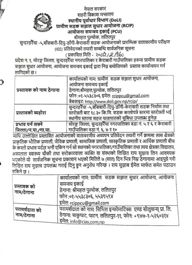 » बाँसबारी-डिपु-डाँगी-केराबारी सडक आयोजनाको प्रारम्भिक वातावरणीय परिक्षण (iee) प्रतिवेदन तयारी सम्बन्धि सार्वजनिक सूचना ।