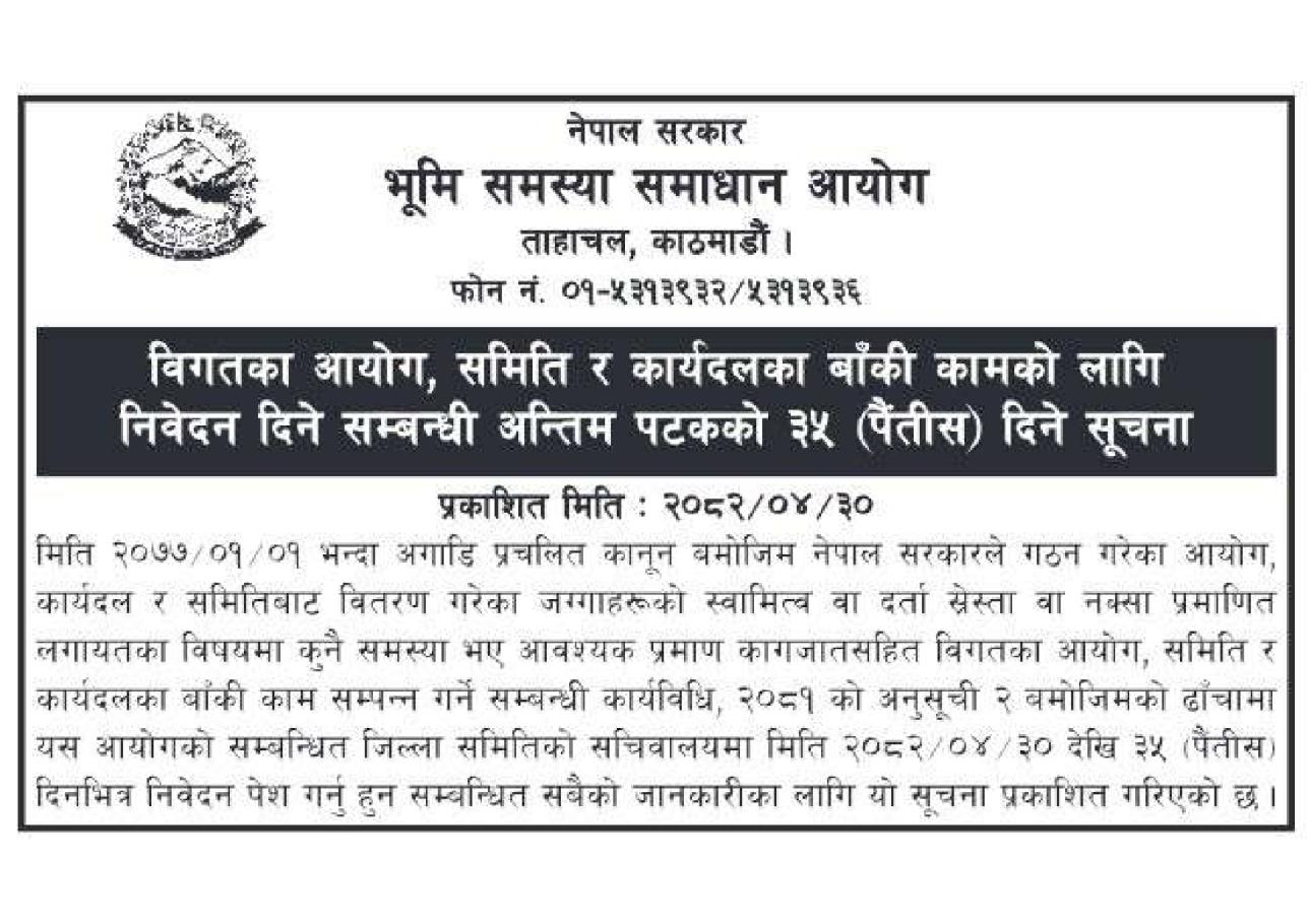 बिगतका आयोग, समिति र कार्यदलका बाँकी कामको लागि निवेदन दिने सम्बन्धी सूचना ।