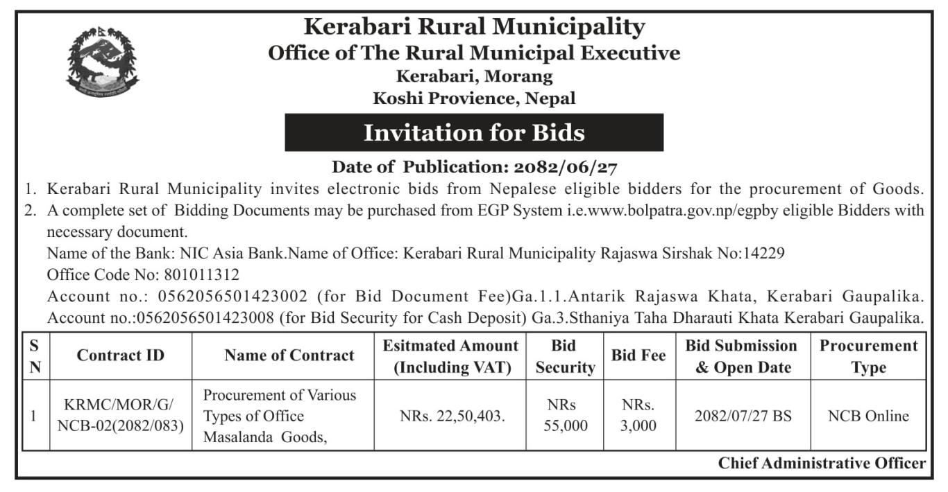 मसलन्द सामाग्री खरिद सम्बन्धी बोलपत्र आव्हानको सूचना ।