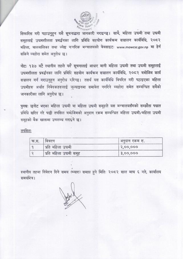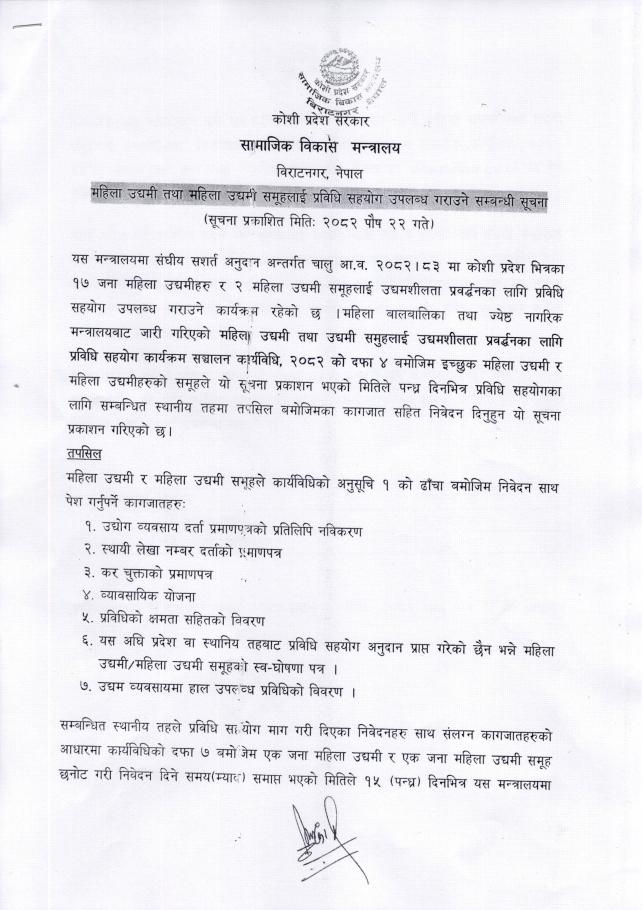 महिला उद्यमी तथा उद्यमी समुहलाई प्रविधि सहयोग उपलव्ध गराउने सम्बन्धी सामाजिक विकास मन्त्रालय कोशी प्रदेशको सूचना ।
