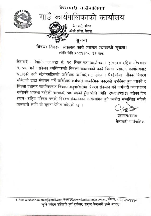 » मिति २०८१।०५।३१ गते १ दिन मात्र राष्ट्रिय परिचय-पत्रको विवरण संकलन कार्य स्थगन सम्बन्धी सूचना ।