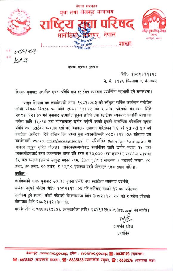 » युवावाट उत्पादित सूचना प्रविधी तथा स्टार्टअप व्यवसाय प्रदर्शनीमा सहभागी हुने सम्बन्धिको राष्ट्रिय युवा परिषदको सूचना ।