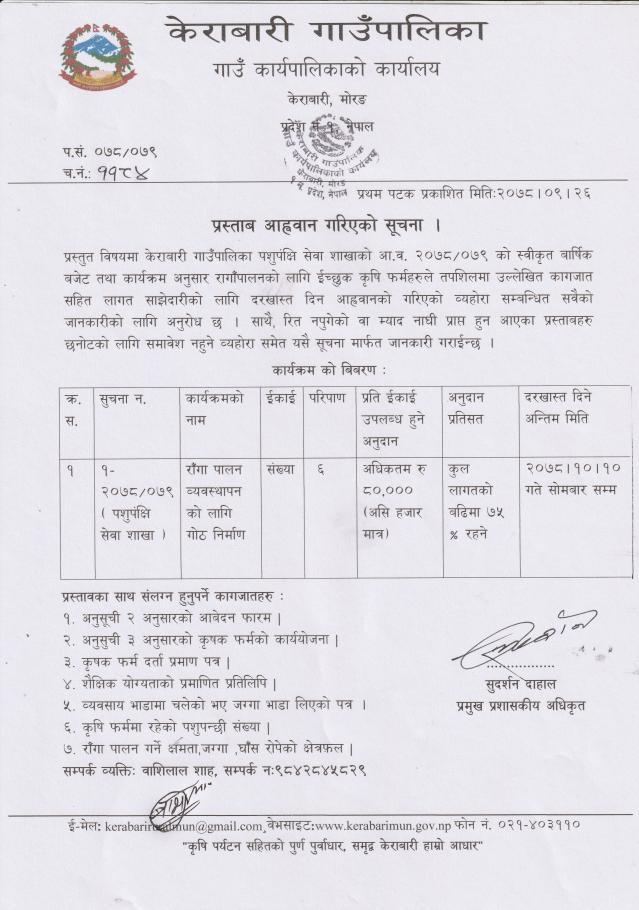 » राँगा पालन व्यवस्थापनको लागि गोठ निर्माण कार्यको लागि प्रस्ताब आह्ववान गरिएको सूचना ।