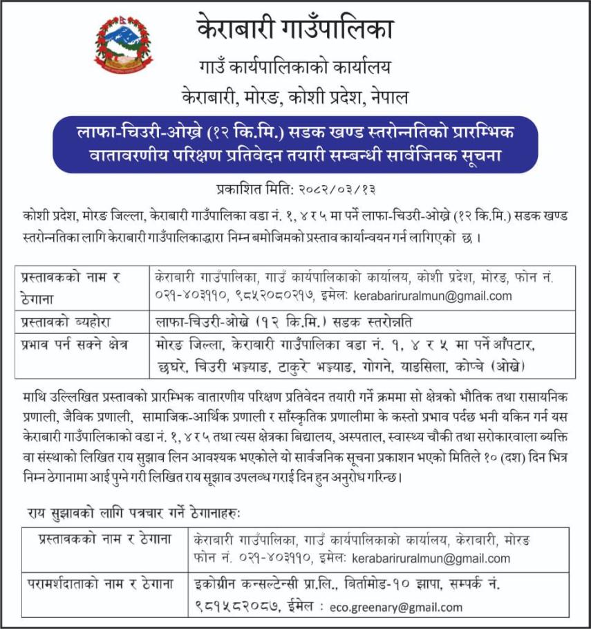 » लाफा-चिरुरी-ओख्रे (१२ कि.मि.) सडक खण्ड स्तरोन्नतिको प्रारम्भिक वातावरणीय परिक्षण प्रतिवेदन तयारी सम्बन्धी सार्वजनिक सूचना ।