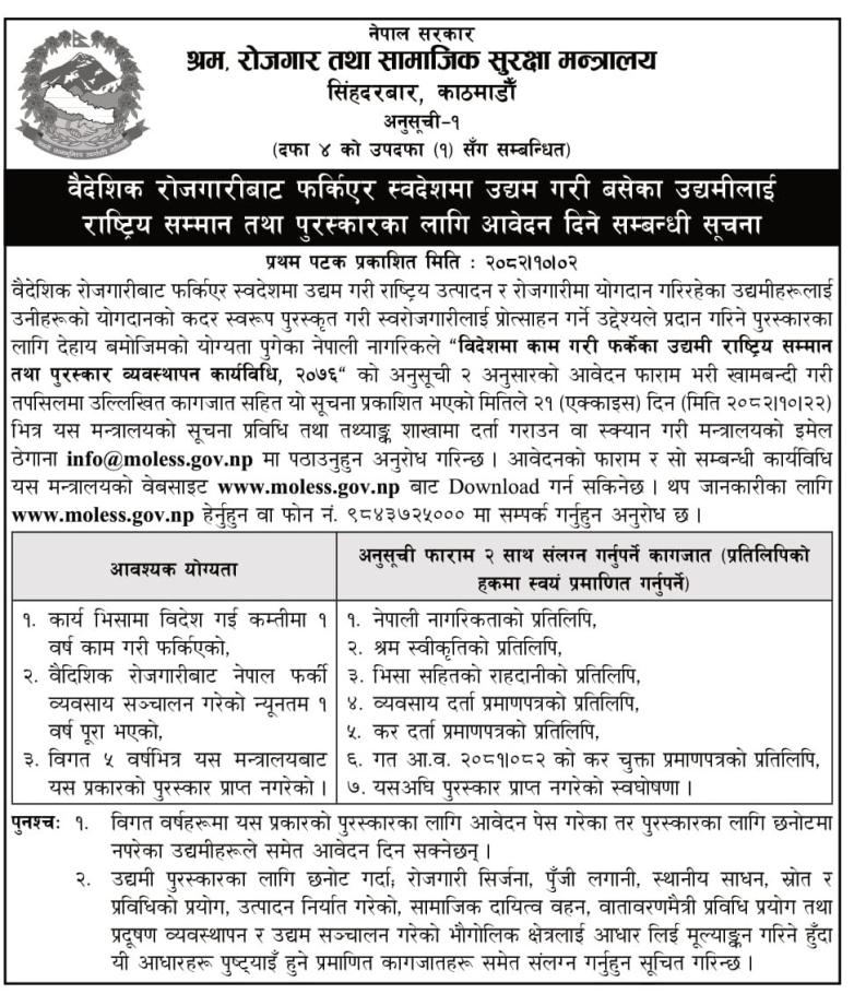 वैदेशिक रोजगारीवाट फर्कीएर स्वदेशमा उद्यम गरी बसेका उद्यमीलाई राष्ट्रिय सम्मान तथा पुस्कारका लागि आवेदन दिने सम्बन्धी नेपाल सरकार श्रम, रोजगार तथा सामाजिक सुरक्षा मन्त्रालयको सूचना ।(फारम भर्ने अन्तिम मिति २०८२।१०।२२)
