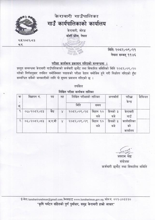 वैद्य र अनमी पदको परीक्षा कार्यक्रम प्रकाशन गरिएको सूचना ।