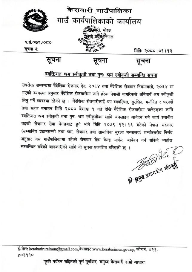 व्यक्तिगत श्रम स्वीकृती तथा पुनः श्रम स्वीकृती सम्बन्धी सूचना ।