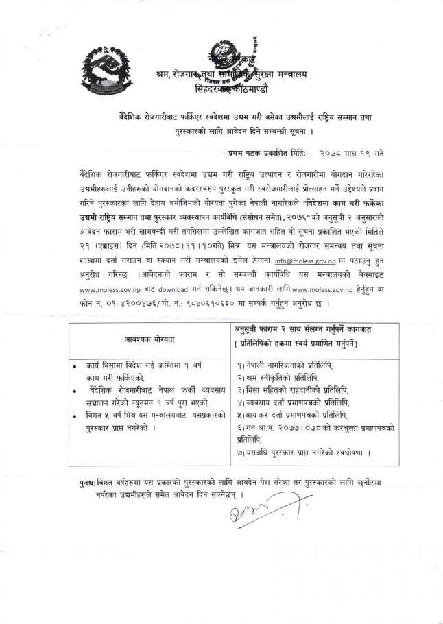 श्रम, रोजगार तथा सामजिक सुरक्षा मन्त्रालय सिंहदरवार काठमाण्डौको वैदेशिक रोजगारीवाट फर्किएर स्वदेशमा उद्यम गरी बसेका उद्यमीहरुलाई राष्ट्रिय सम्मान तथा पुरस्कारको लागि आवेदन दिने सम्बन्धि २़१ दिने सूचना ।