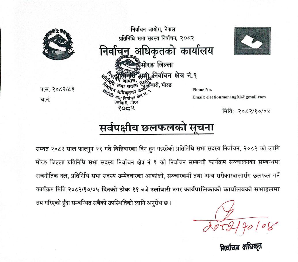 सर्वपक्षीय छ्लफल सम्बन्धी मोरङ प्रतिनिधि सभा निर्वाचन क्षेत्र नं १, निर्वाचन अधिकृतको कार्यालय उर्लावारीको सूचना ।