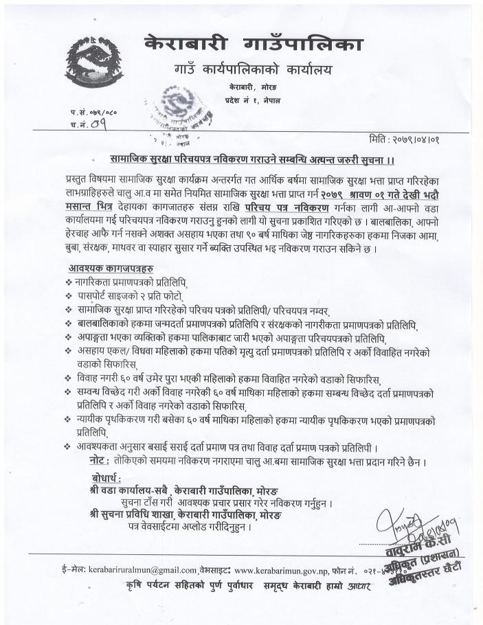 सामाजिक सुरक्षा परिचयपत्र नविकरण गर्ने गराउने सम्बन्धि अत्यन्त जरुरी सूचना ।