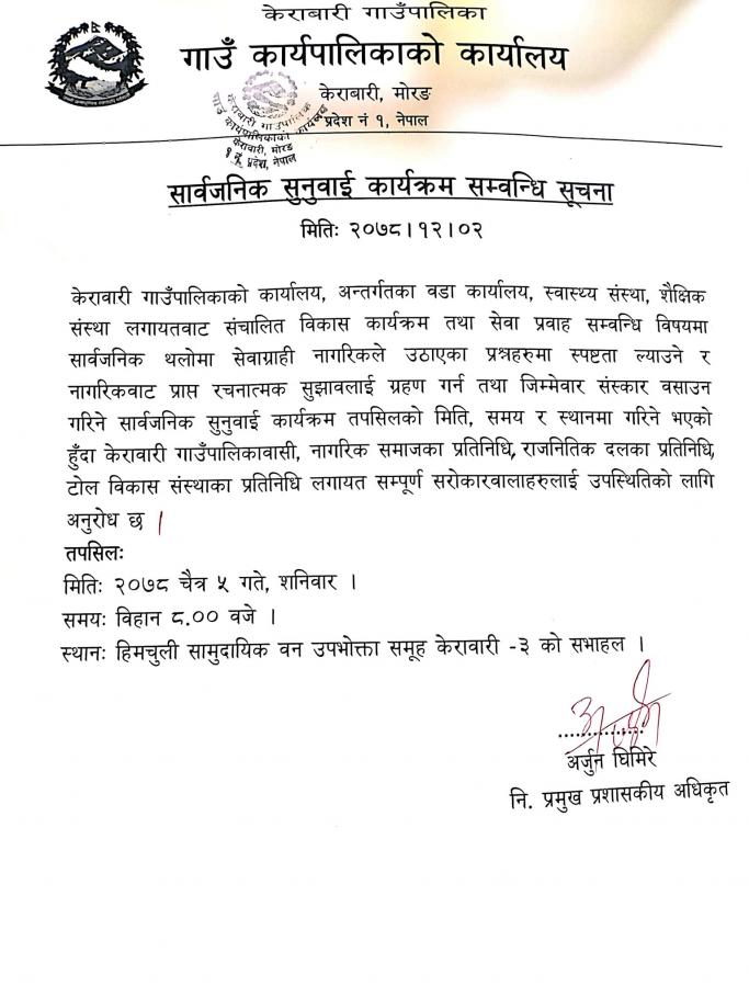 सार्वजनिक सुनुवाई कार्यक्रम सम्बन्धि सूचना ।