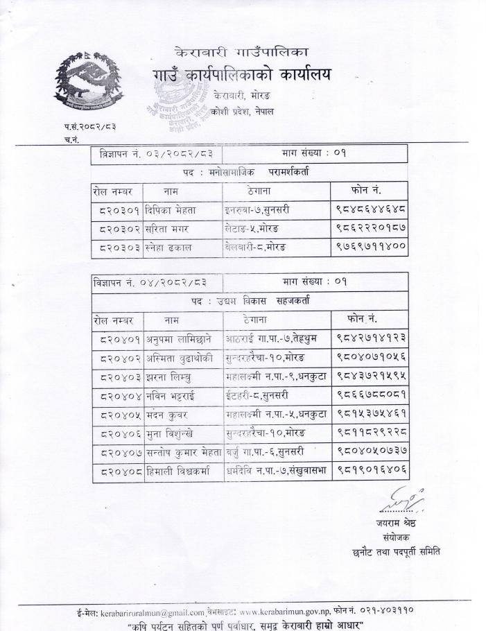 Home » सेवा करारवाट पदपुर्ती गरिने विभिन्न पदहरुमा प्रतियोगतात्मक परीक्षाका लागि दरखास्त पेश गर्नुहुने निवेदकको स्वीकृत नामावली प्रकाशन गरिएको सम्बन्धी सूचना ।