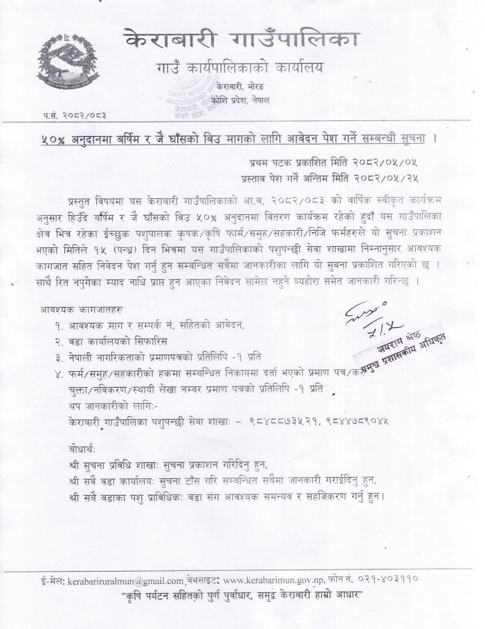 » ५०% अनुदानमा बर्षिम र जै घाँसको बिउ मागको लागि आवेदन पेश गर्ने सम्बन्धी सूचना ।