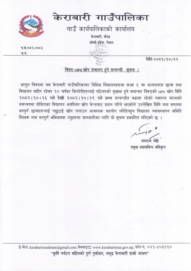 HPV खोप संचालन हुने सम्बन्धि सूचना ।